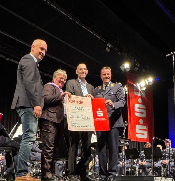 Auch in diesem Jahr beeindruckte das Luftwaffenmusikcorps Münster wieder mit ausgewählten Musikstücken in einem volles Haus. Zur Tradition der Veranstaltung gehört auch, dass die Konzerteinnahmen an ortsansassigen Vereine gespendet wird. Diese gemeinnützige Verwendung ist nur möglich, da dass Luftwaffenmusikcorps Münster auf seine Gage verzichtet. So konnte Werner Twent als Vorsitzender der Kreissparkasse Halle-Wiedenbrück der Gütersloher Tafel e.V., vertreten durch Ruth Prior-Dresemann, die Spende auf der Bühne überreichen.